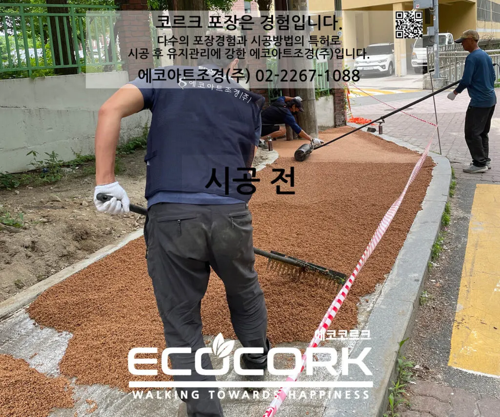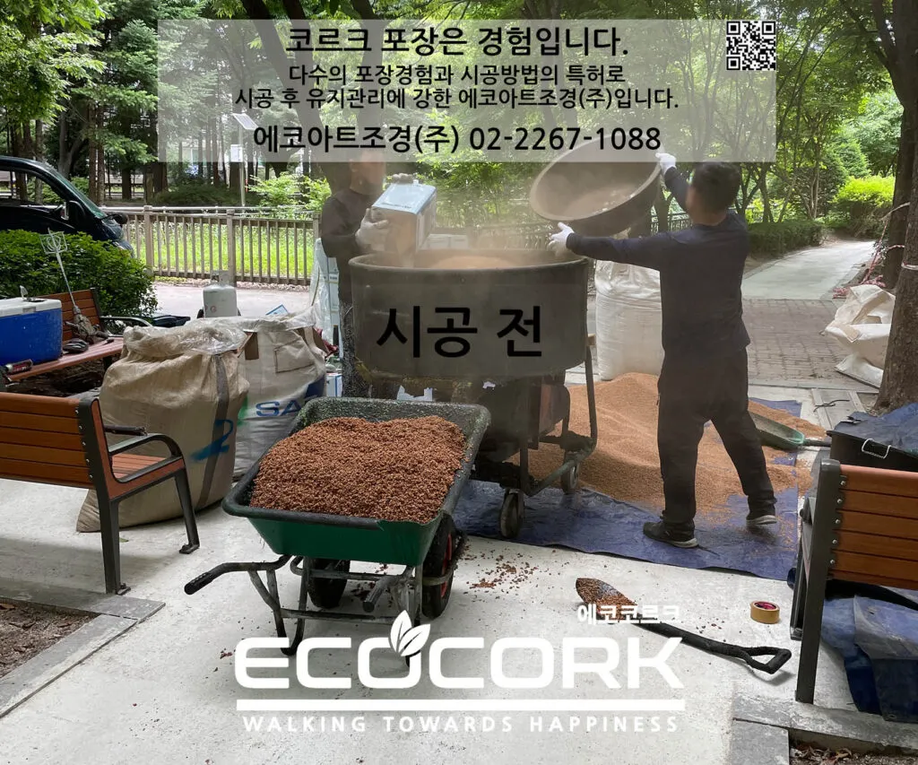 코르크 입자와 바인더를 에코아트조경(주)만의 최상의 비율로 혼합하여 포설합니다.