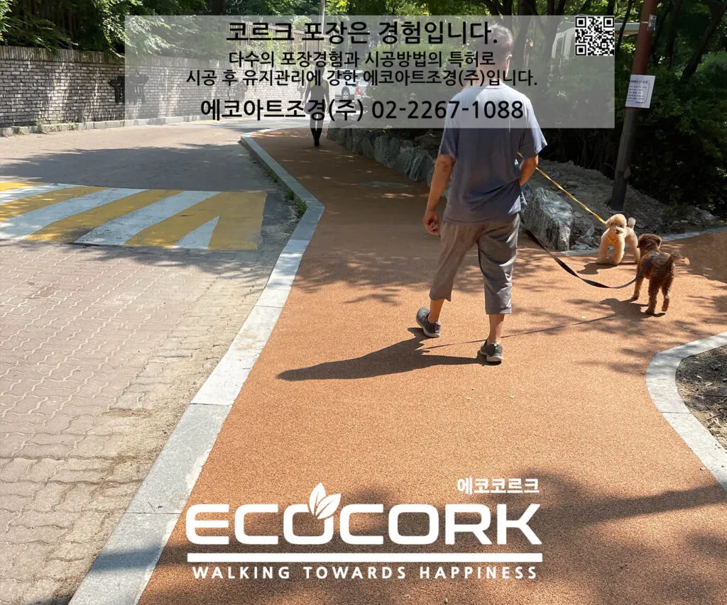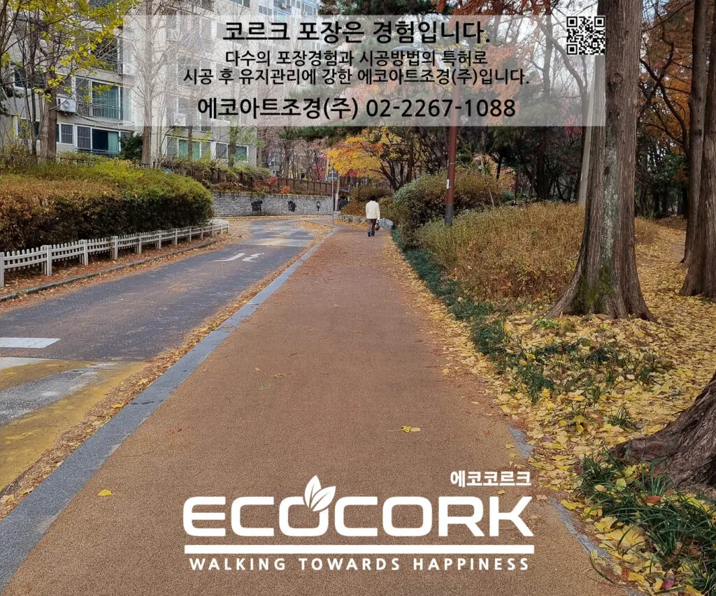 높은 탄성으로 무릎,발목에 무리를 주지 않고, 보행감이 우수한 에코 코르크 포장재와
