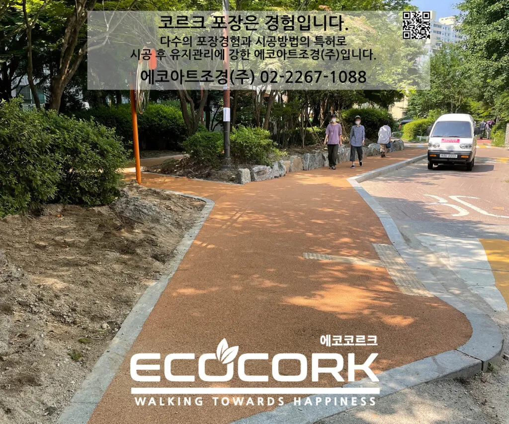 에코코르크는 충격과 마찰에 강하고, 낮은 복사열로 열섬 효과를 완화시키면서 찰과상이나 화상 등