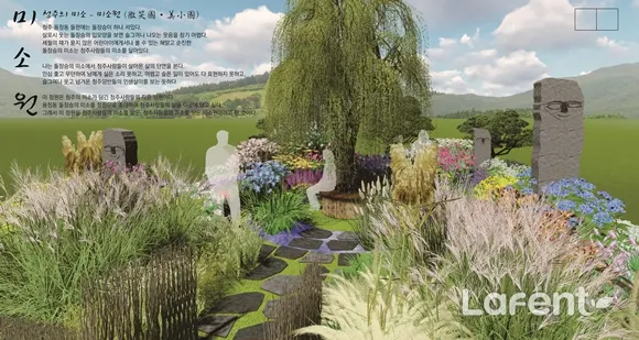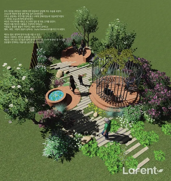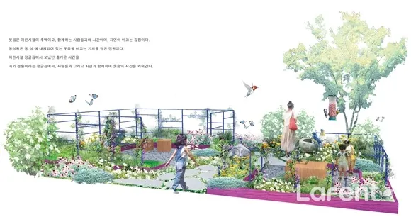 자유를 찾은 종달새가 선물로 물어다 준 세 개의 씨앗으로 웃음꽃 피는 정원이 만들어진다는 스토리텔링을 대지에 그대로 담아 공간을 연출한다. 자연스러운 길 위로 3개의 휴게공간을 조성했고 각 이용객에 따라 휴식을 즐기는 다양한 방법과 공간을 제안한다.