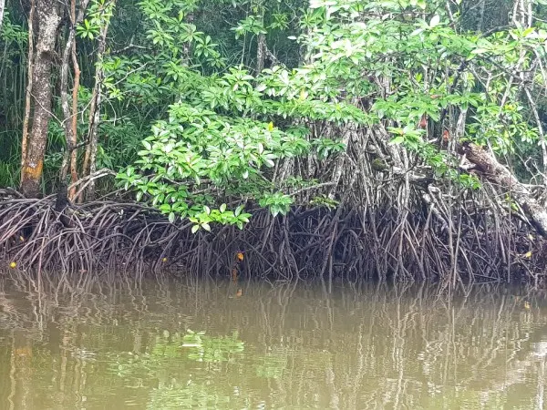 바다와 강의 만나는 지점에서 자라는 맹그로브나무는 모양이 매우 독특합니다. 뿌리가 물 밖에까지 나와있는데 물 아래 땅속에도 10m 이상 깊이 박혀 토양의 유실을 막아주고 태풍으로부터 마을을